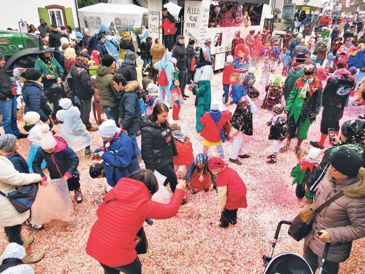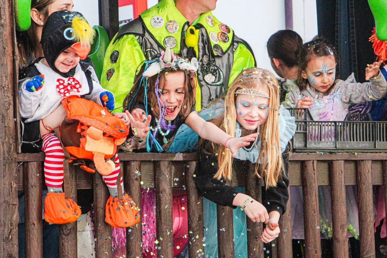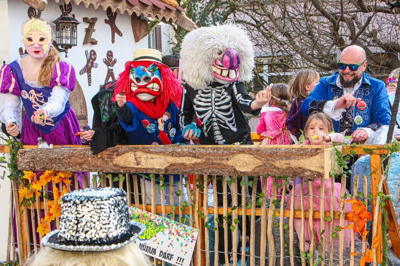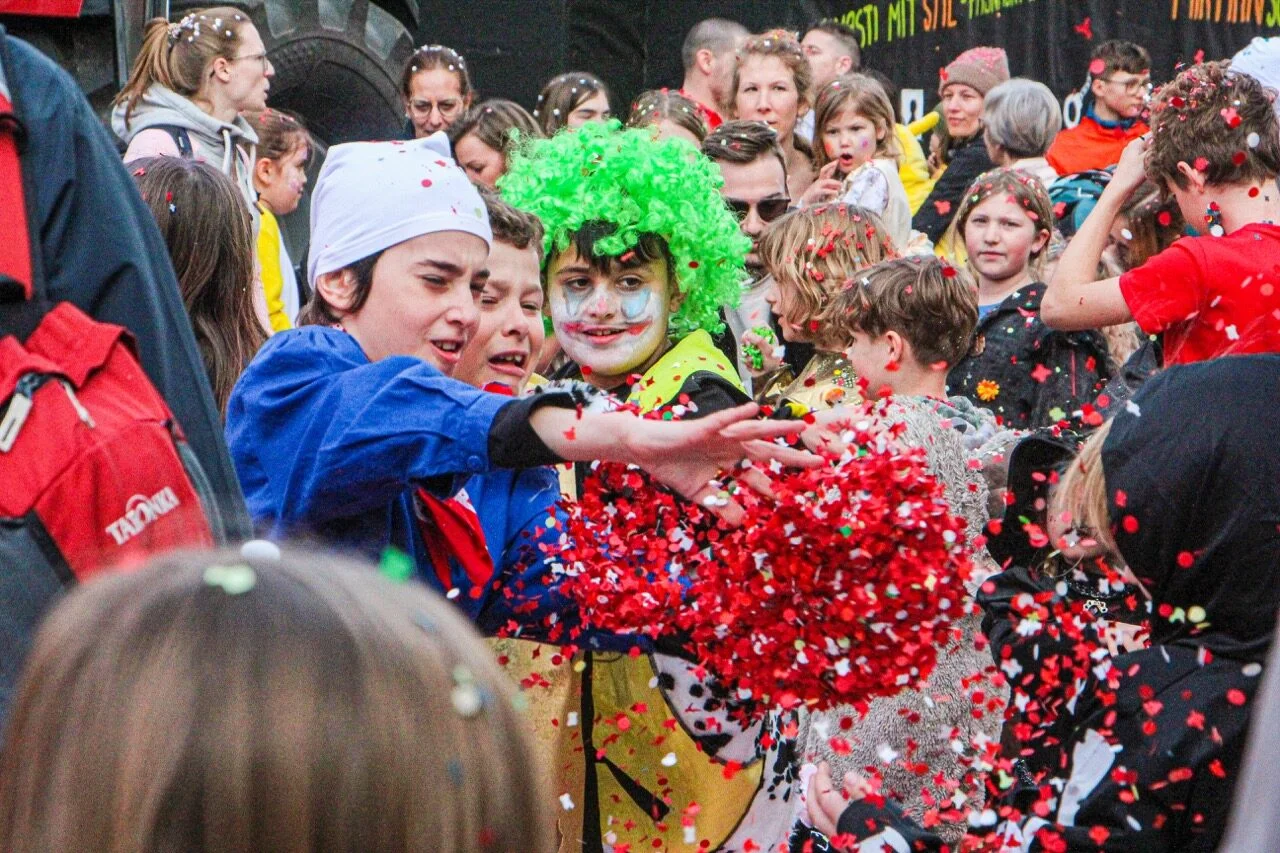 Im Anschluss an den Kinderball zieht der Kinderumzug durchs Dorf. Seinen Höhepunkt erreicht dieser mit der Konfettischlacht vor dem Cheesmeyer.